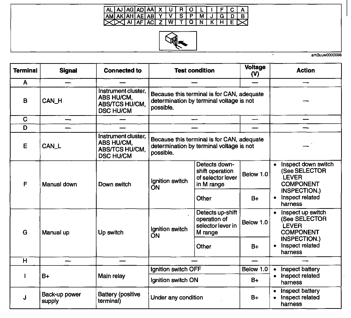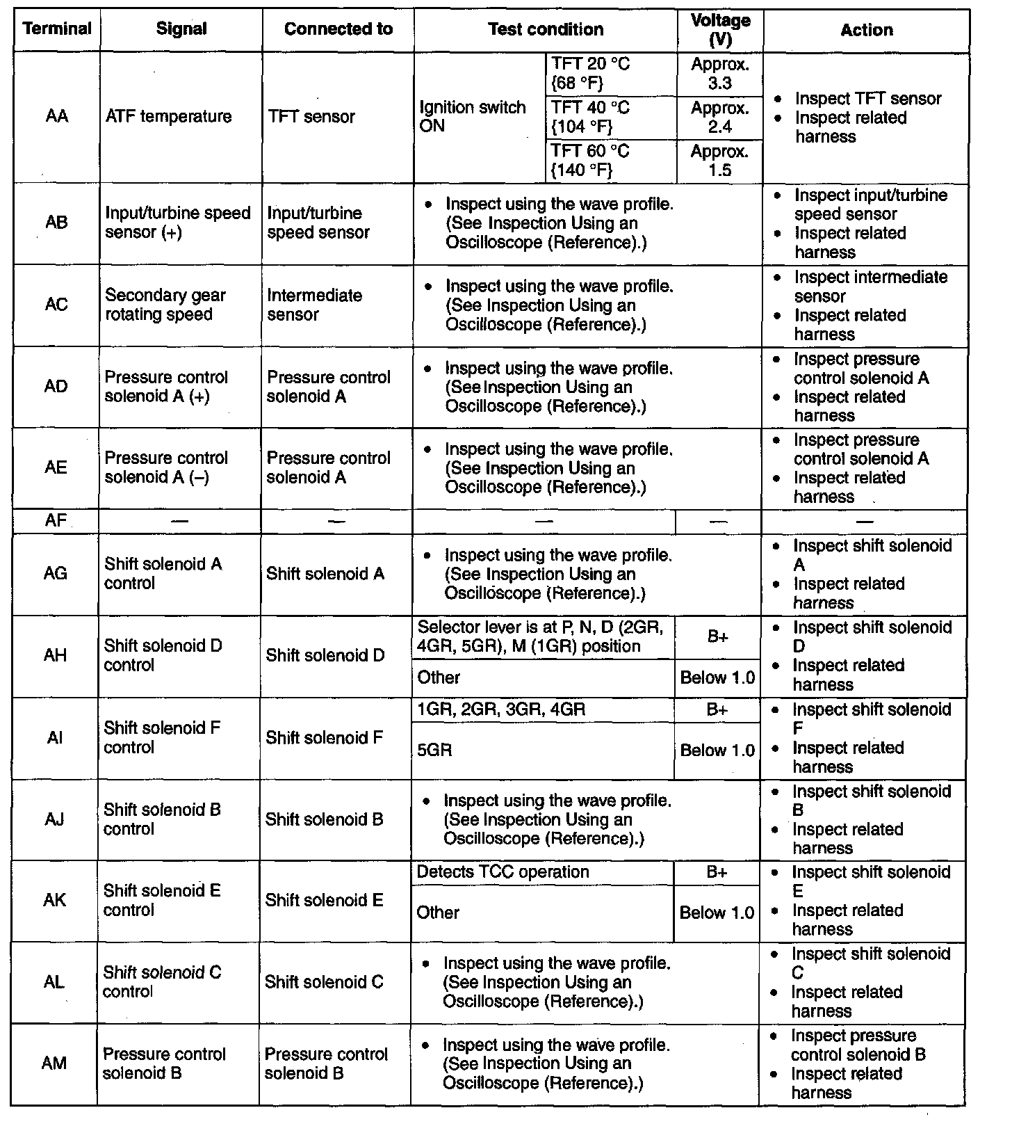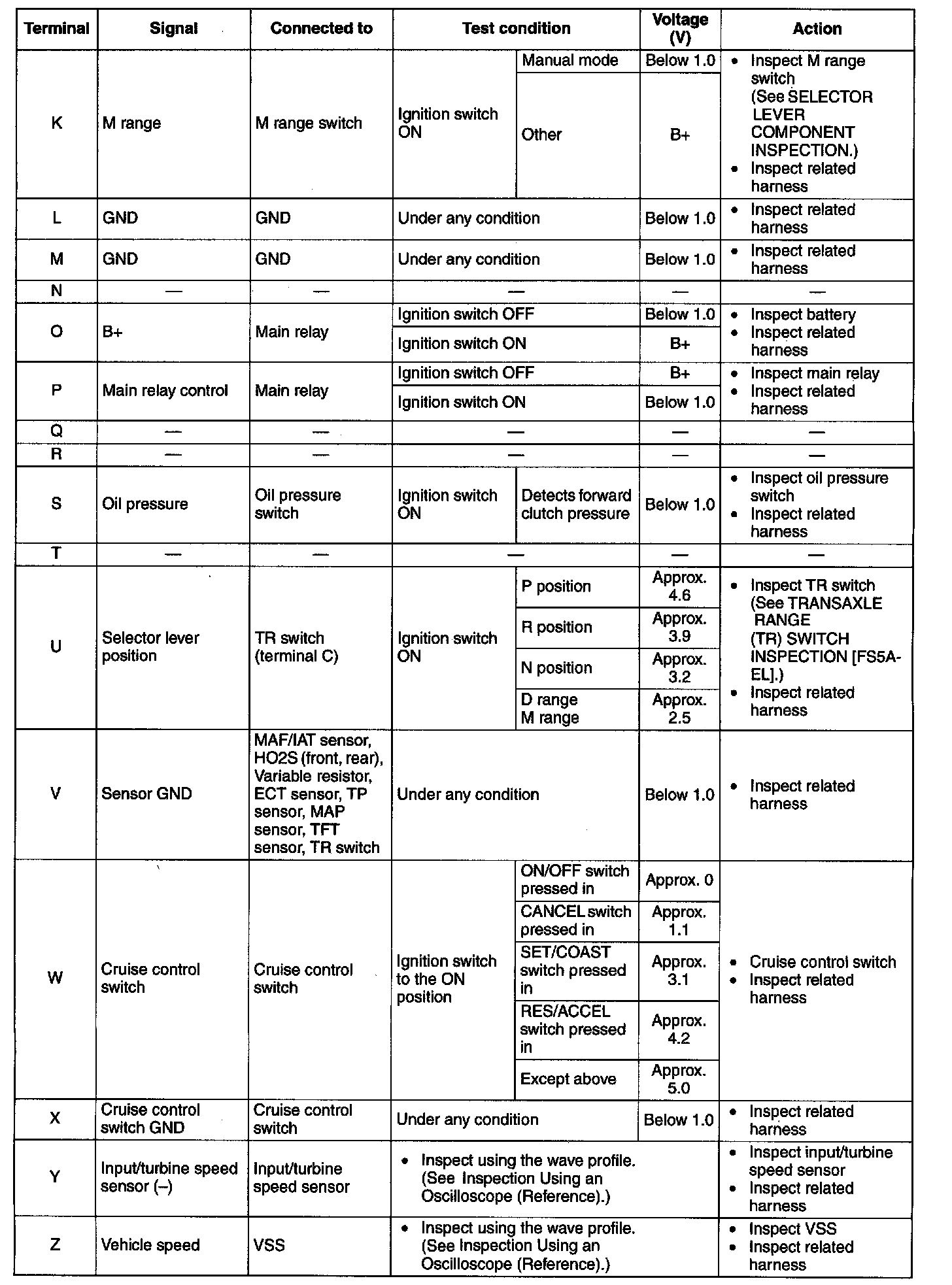 ^ The TCM terminal voltages vary with changes in measuring and vehicle conditions. Always carry out a total Inspection of the input and output systems, and the TCM to determine the cause of trouble. Otherwise, a misdiagnosis could occur.