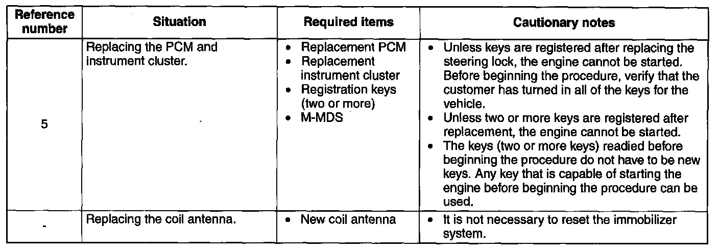- When performing the following procedures, the immobilizer resetting procedure using the M-MDS must also always be performed: "instrument cluster replacement", "PCM replacement", "instrument cluster and PCM joint replacement", "Key ID number clearing". The engine will not start unless all work is performed using the M-MDS.