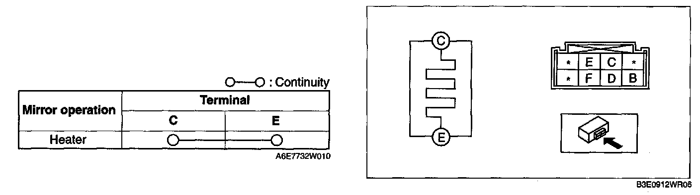 2. Inspect for continuity between the power outer mirror heater terminals.