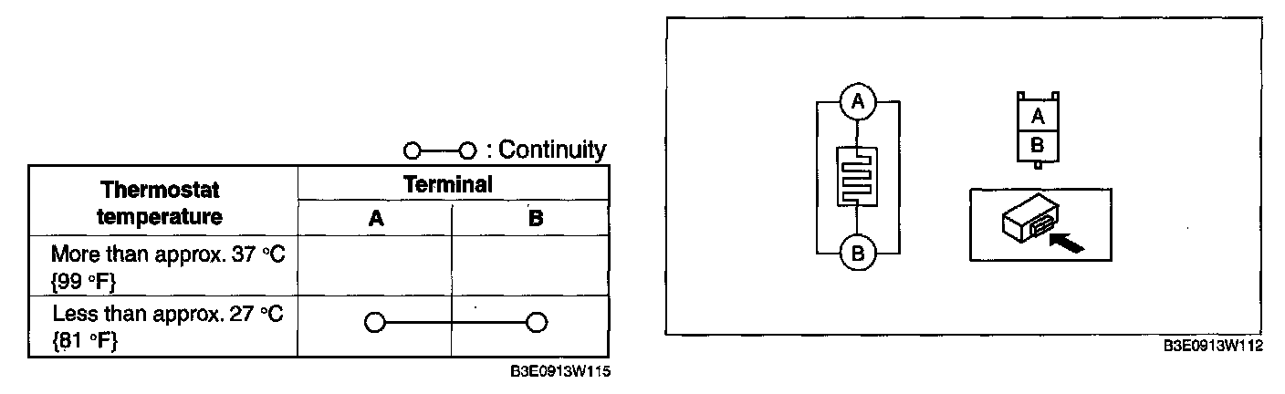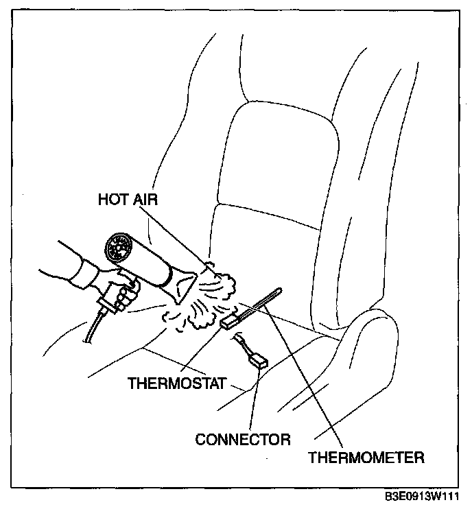 3. While inspecting for continuity between the terminals A and B of the connector, use a dryer to warm the thermostat of the seat warmer unit on seat cushion.
