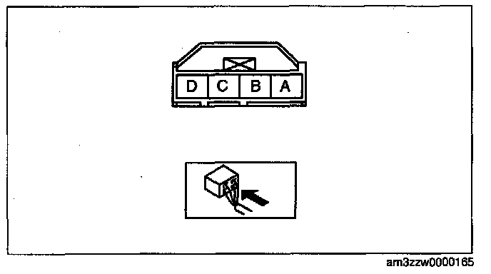3. Measure the voltage between steering angle sensor terminal D and ground. If there is any malfunction, inspect the wiring harness between steering angle sensor terminal D and DSC HU/CM terminal AH. Repair or replace if necessary.