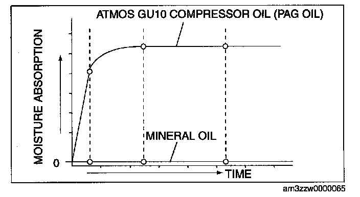 - ATMOS GU1O compressor oil (PAG oil) has a higher moisture absorption efficiency than the previously used mineral oil. If moisture mixes with the compressor oil, the refrigerant system could be damaged. Therefore, install caps immediately after using the compressor oil or removing refrigerant system parts to prevent moisture absorption.