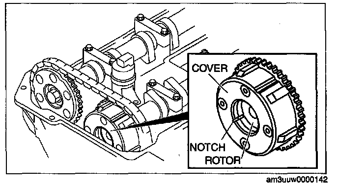 ^ If, when turning the crankshaft, there is a hitting noise from the variable valve timing actuator each time the cam passes the fully lifted position, it means that the actuator is not secured. Replace the actuator.
