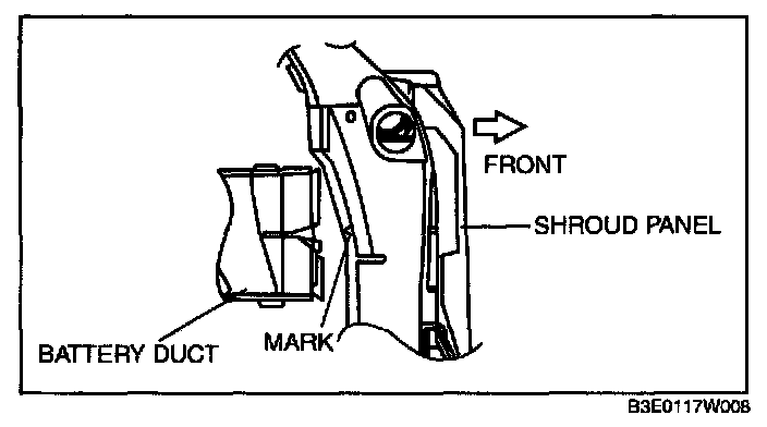 1. Align the mark of the shroud panel with notch in the battery duct, and install the battery duct to the shroud panel.