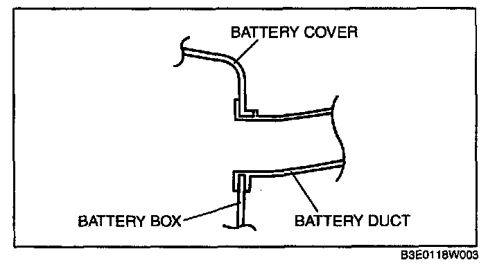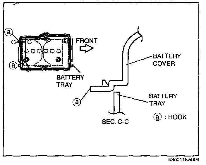 1. Assemble with battery box hooks E aligned with the battery tray holes at two points.