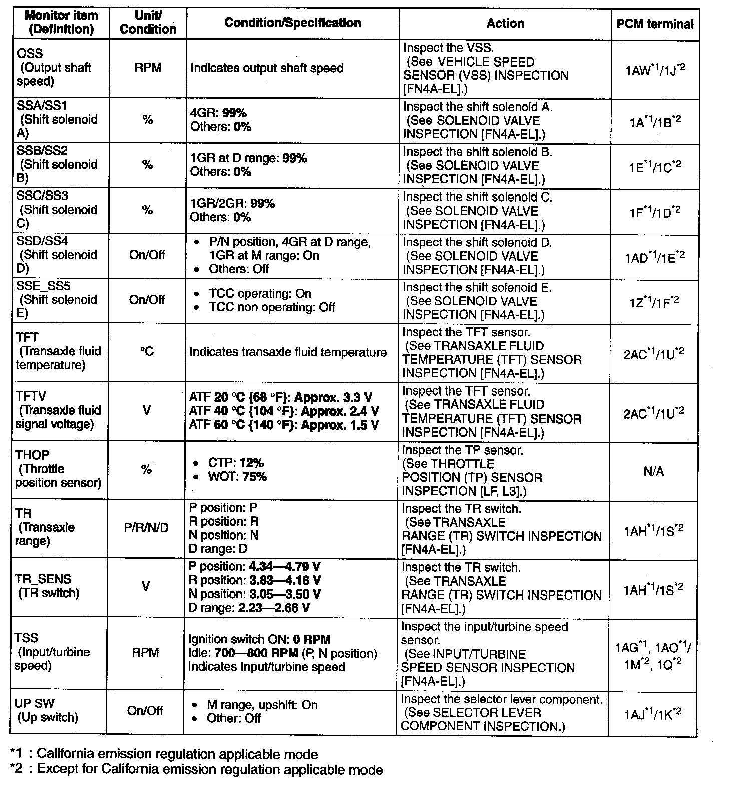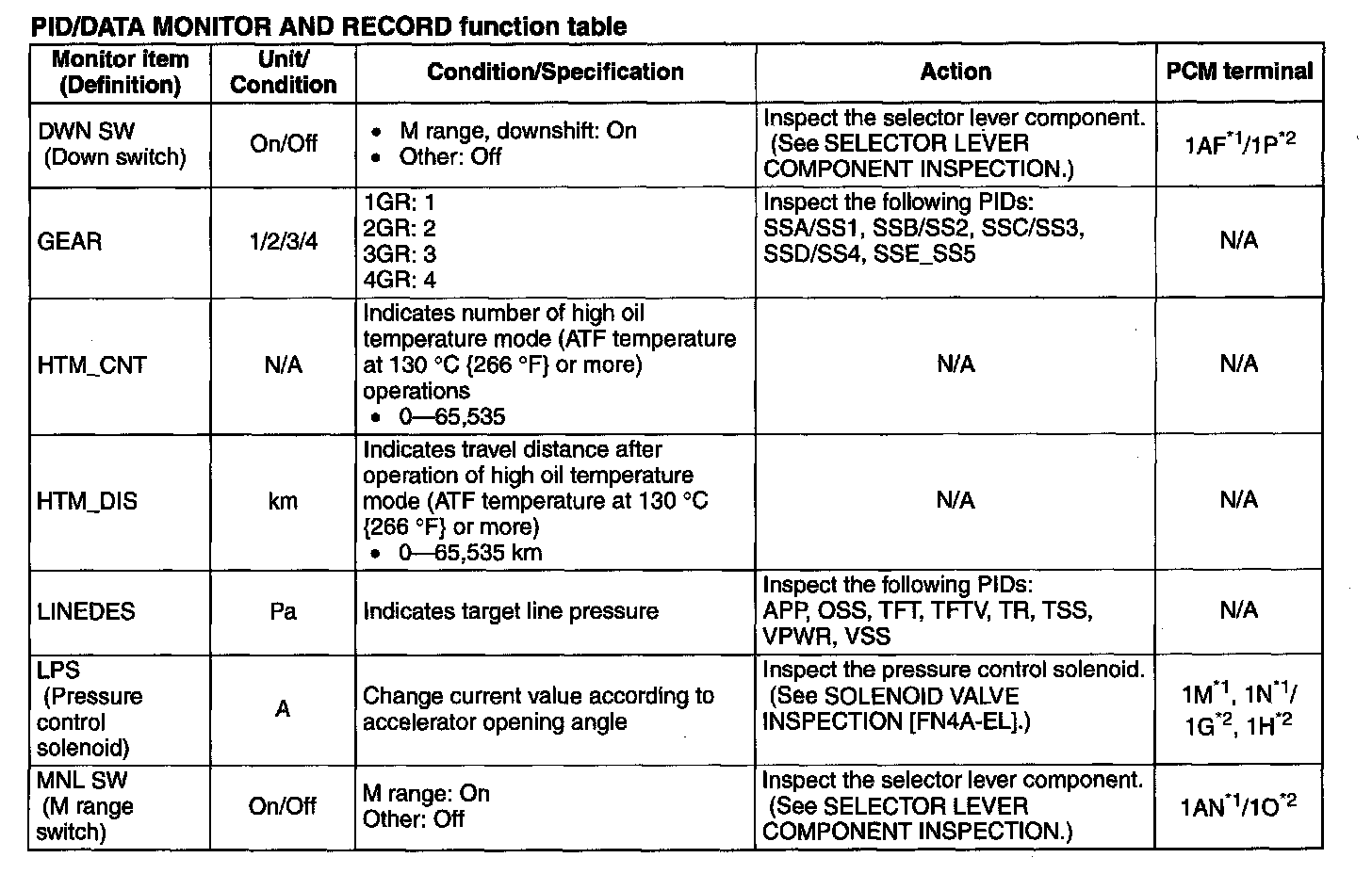 ^ The PID/DATA MONITOR function monitors the calculated value of the input/output signals in the PCM. Therefore, if a monitored value of an output device is out of specification, it is necessary to inspect the monitored value of the input device related to the output device control. Since an output device malfunction is not directly indicated as a malfunction of the monitored value for the output device, it is necessary to inspect the output device individually using methods such as the simulation function.