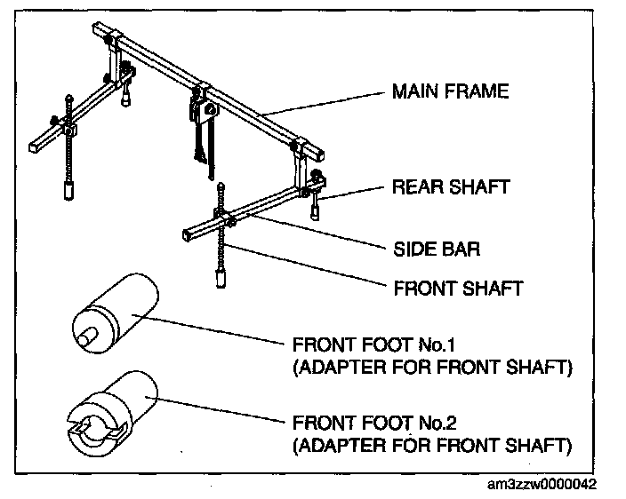 (3) Install front foot No.2 to the left/right front shaft of the SST, then align the groove of the front shaft of the SST with the folded up part of the vehicle as shown in the figure.