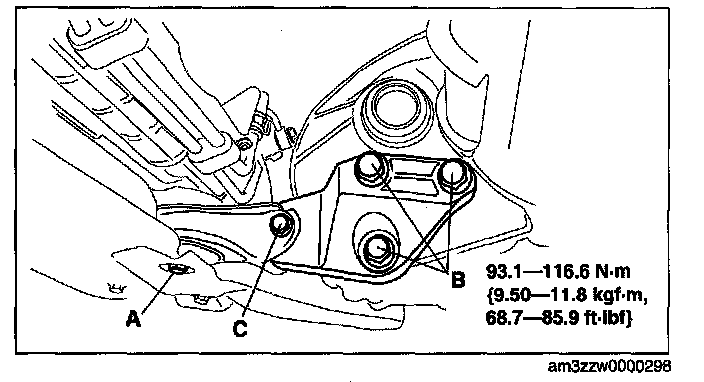 3. Tighten the bolts B, and then temporarily tighten the bolt A and C.