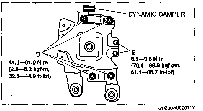 7. Place the dynamic damper over the battery tray bracket with the body stud bolts passing through the holes, then tighten the bolts and nuts in the order of D, E.