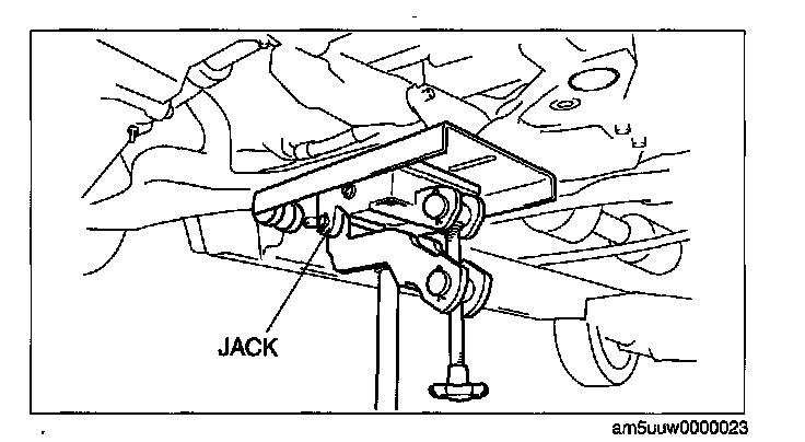 3. Raise the transmission jack gradually and install the front crossmember to the vehicle. At this point verify that the SST is securely inserted in the positioning holes on the body.