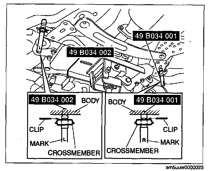 1. Verify the left and right identification marks and install the positioning SST to the front crossmember.