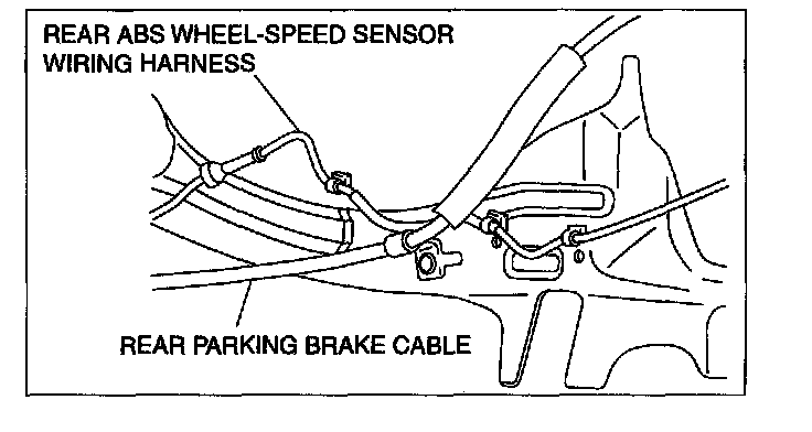 1. Pass the rear ABS wheel-speed sensor wiring harness outside the rear parking brake cable as shown in the figure.