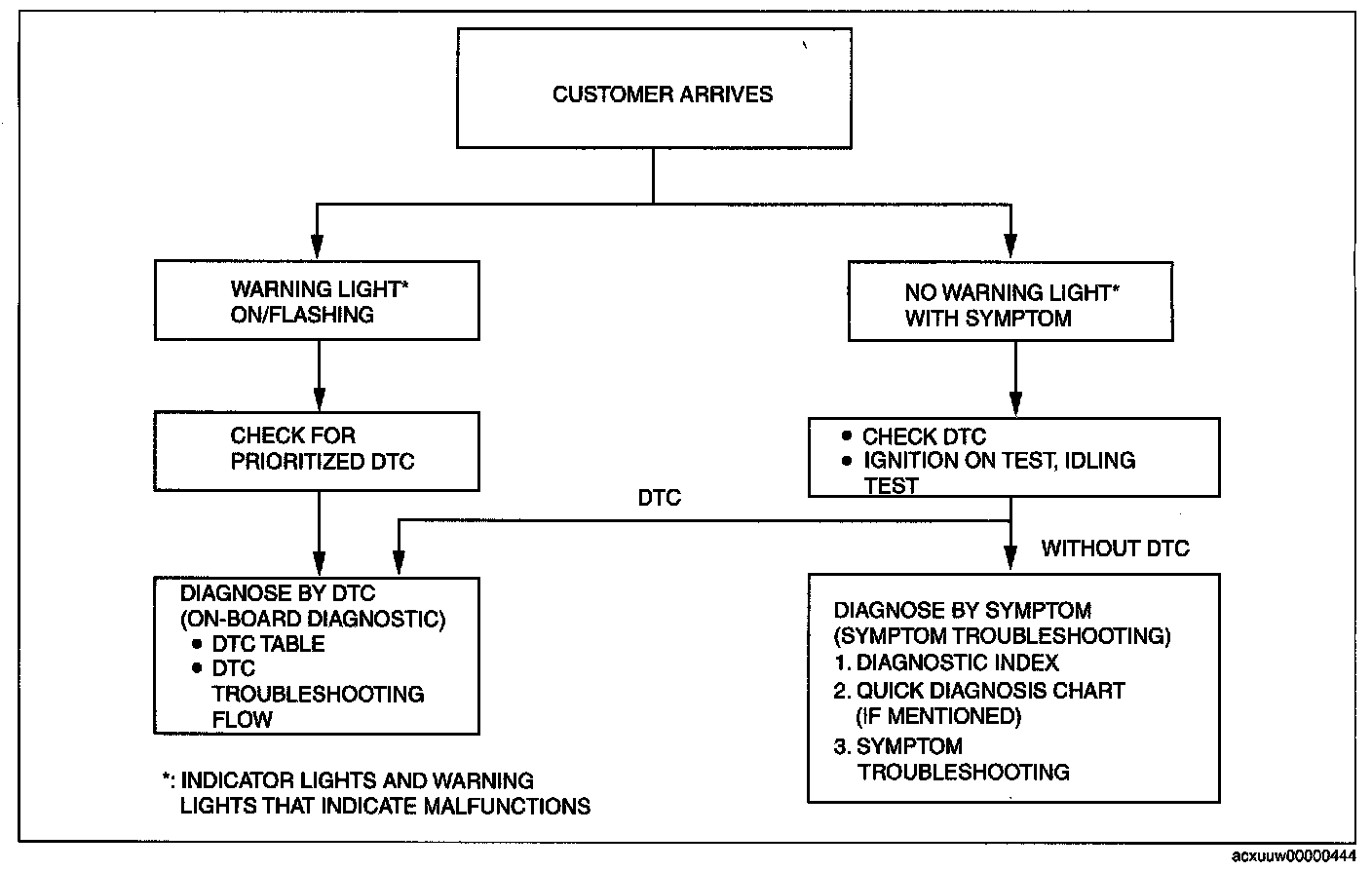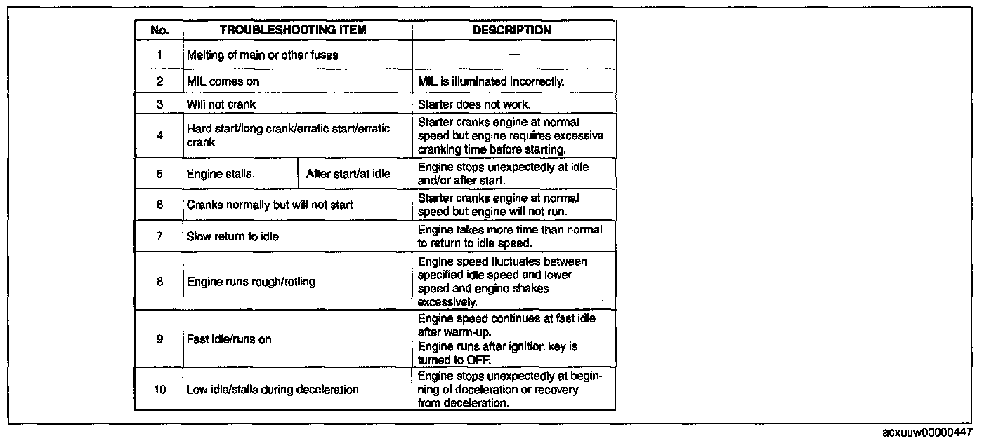 - The quick diagnosis chart lists diagnosis and inspection procedures to be performed specifically relating to the cause of the malfunction.