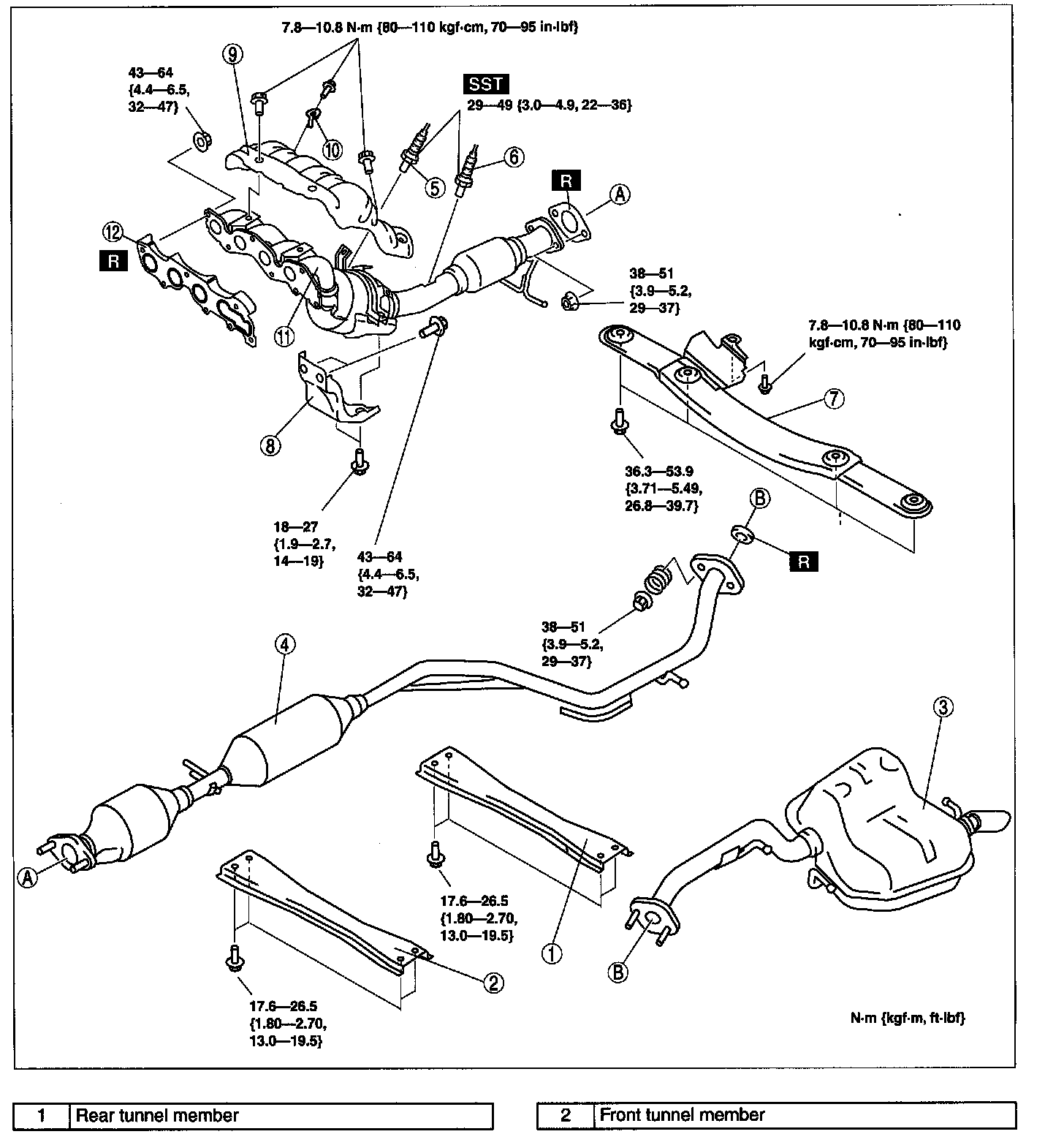 ^ A hot engine and exhaust system can cause severe burns. Turn off the engine and wait until they are cool before removing the exhaust system.