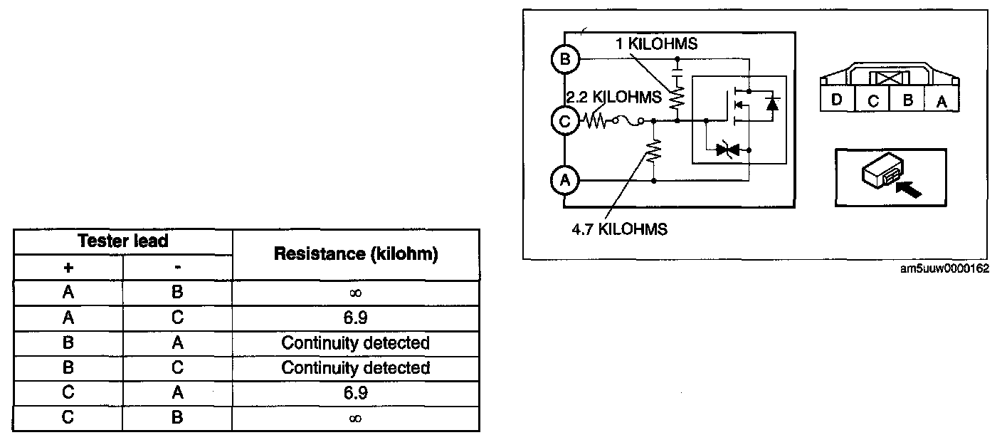 FRONT POWER METAL OXIDE SEMICONDUCTOR FIELD EFFECT TRANSISTOR (POWER MOS FET) INSPECTION [FULL-AUTO AIR CONDITIONER]1. Verify that the continuity between the front power MOS FET terminals is as indicated in the table.