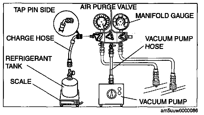 CAUTION: Close the manifold gauge valve immediately after stopping the vacuum pump. If the valve is left open, the vacuum pump oil will flow back into the refrigeration cycle and cause a decrease in the efficiency of the air conditioner.