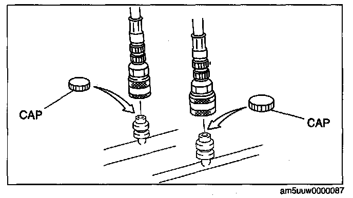 CAUTION: Always being charging of refrigerant from the high-pressure side. If changing is begun from the low-pressure side, the vanes of the A/C compressor will not be released and abnormal noise may result.
