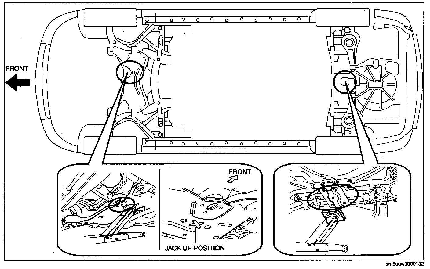 - Near the center of the front crossmember.