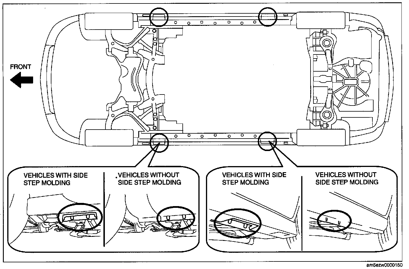 - Both sides of the vehicle, on side sills.