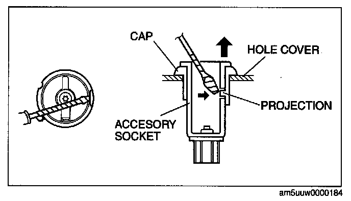 1. While pressing a tape-wrapped flathead screwdriver against the cap projection, pull the accessory socket outward.