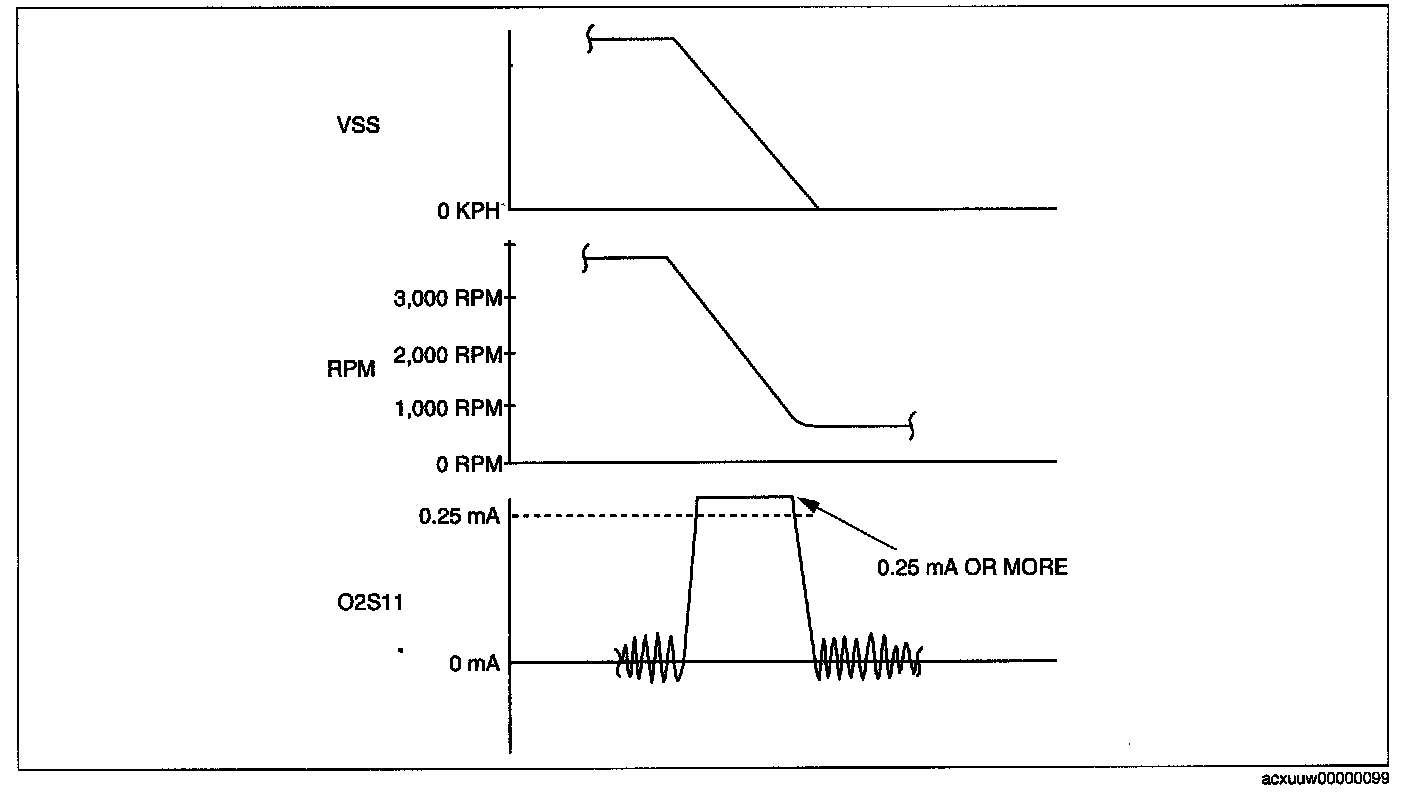 4. Verify that the front HO2S current (PID: 02S11) is 0.25 mA or more while decelerating as shown in the figure.