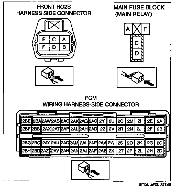 - Front HO2S terminal A and main relay terminal C