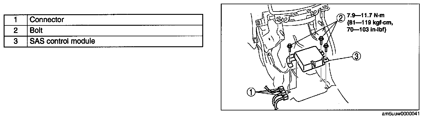 - If the SAS control module is replaced, turn the ignition switch to the ON position for 20 s or more after completing the configuration. (See SAS CONTROL MODULE CONFIGURATION.) Testing and Inspection