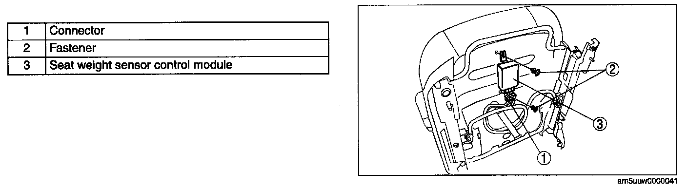 SEAT WEIGHT SENSOR CONTROL MODULE REMOVAL/INSTALLATIONCAUTION: When the seat weight sensor control module is replaced with a new one, calibrate the seat weight sensor using the M-MDS. (See SEAT WEIGHT SENSOR CALIBRATION.)