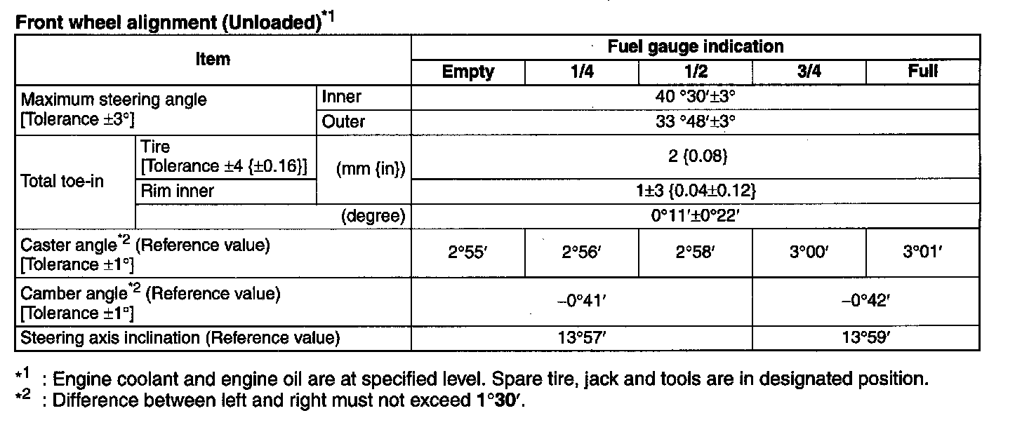 Front wheel alignment (Unloaded)*1 : Engine coolant and engine oil are at specified level. Spare tire, jack and tools are in designated position.