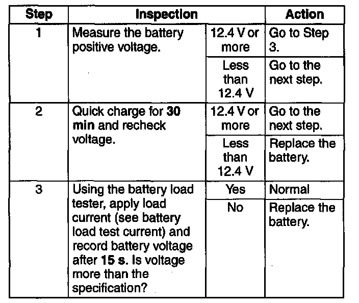 - If it is less than the specification, recharge the battery. (See BATTERY RECHARGING [L3].)