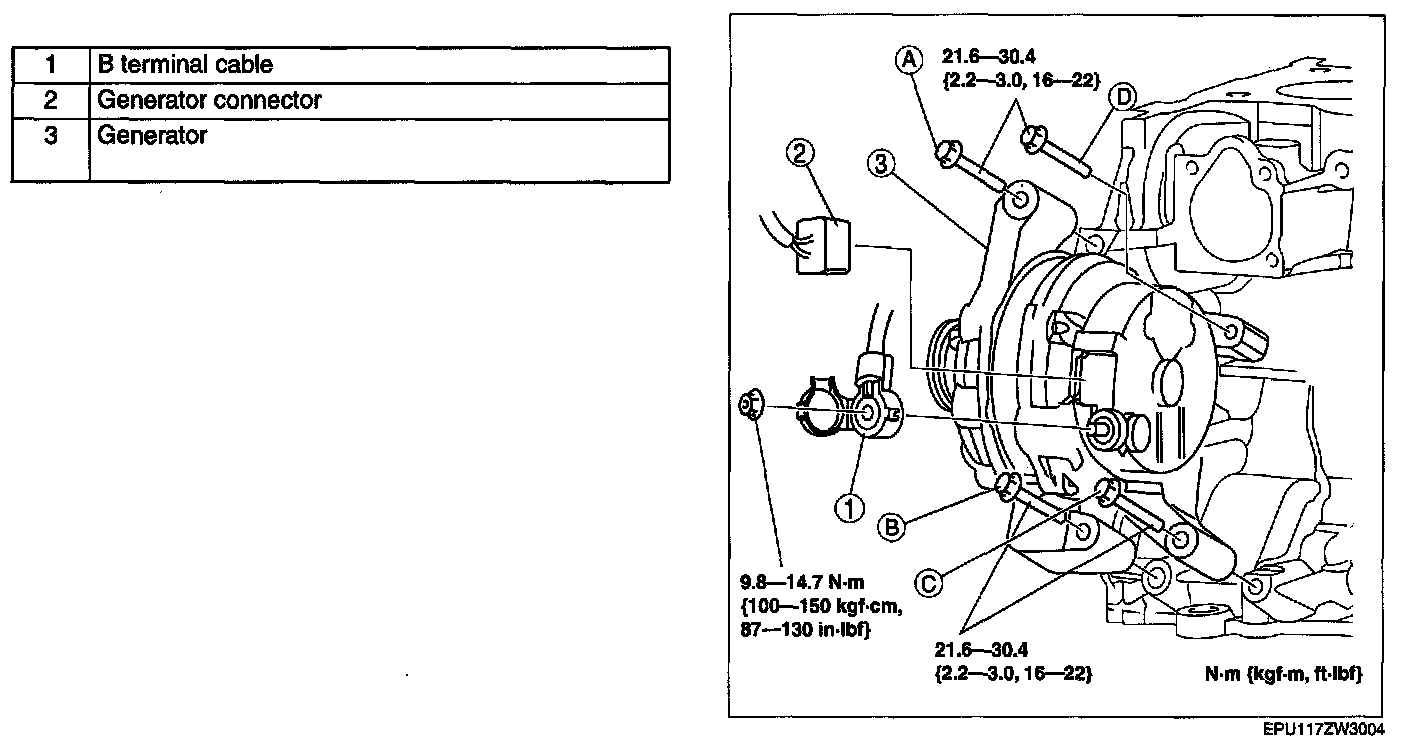 2. Tighten the generator installation bolts in the order A, B, C, and D.
