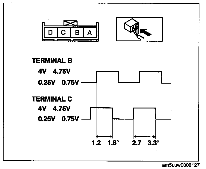 5. Turn the steering wheel to the right and left, and verify that the voltage and pulses at the terminals are as shown in the figure.