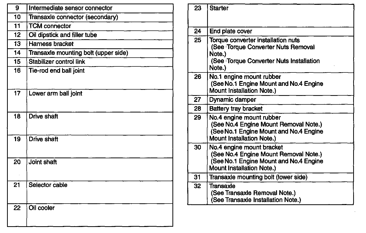 ^ To prevent the torque converter and transaxle from separating, remove the transaxle without tilting it toward the torque converter.