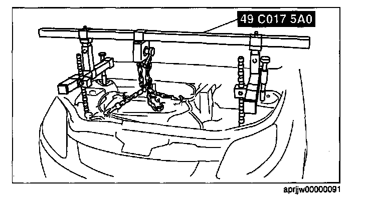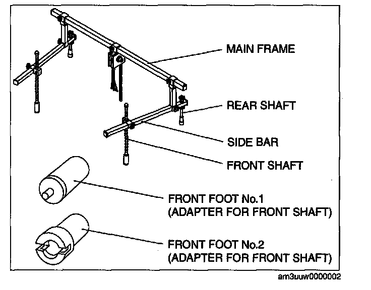 4) Install front foot No.2 to the left front shaft of the SST, then align the groove of the left front shaft of the SST with the folded up part of the vehicle frame (Identical position to right side).