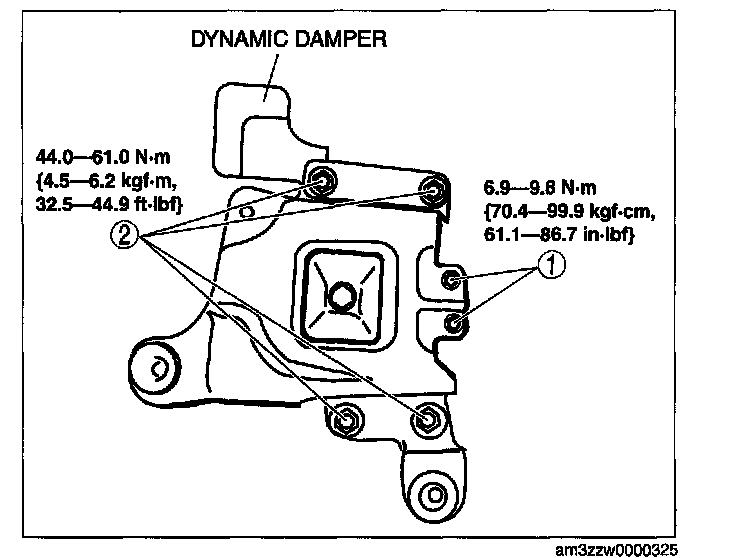 5. Place the dynamic damper over the battery tray bracket with the body stud bolts passing through the holes, then tighten the bolts and nuts in the order shown in the figure.