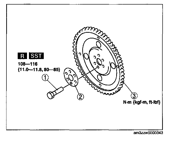 Tightening torque 108-116 N-m (11.0-11.8 kgf-m, 79.7-85.5 ft-lbf)