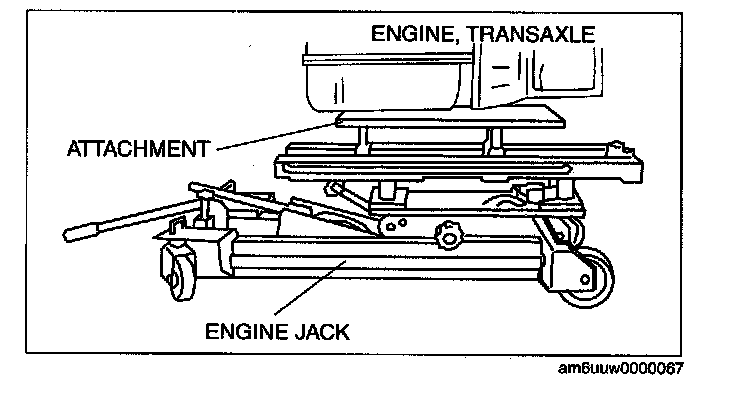 6. To firmly support the engine, first set the engine jack and attachment to the oil pan.