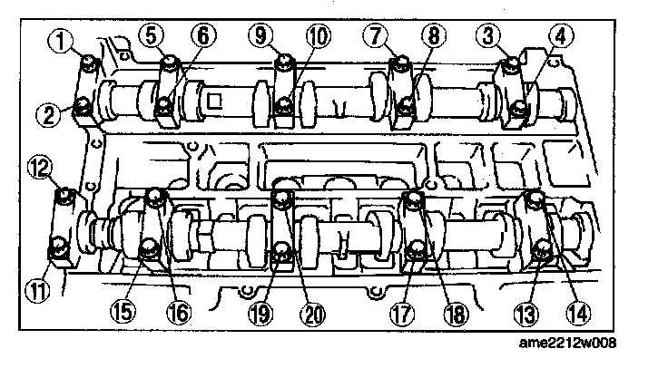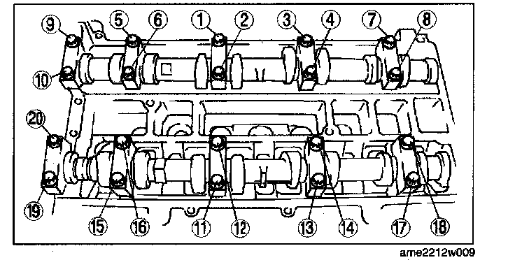 1. Loosen the camshaft cap bolts in two or three steps in the order shown in the figure.