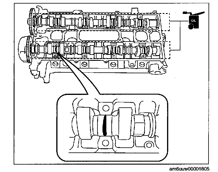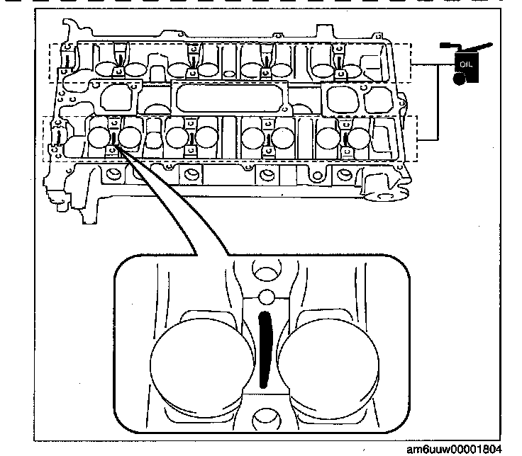 1. Apply the gear oil (SAE No. 90 or equivalent) to each journal of the cylinder head as shown in the figure.