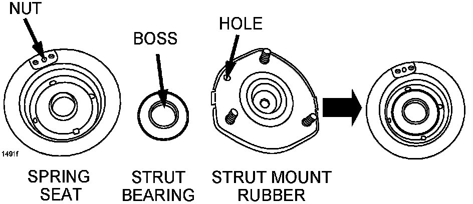 e. Engage boss part of strut bearing (A) in bottom hole of strut mount rubber (B), and install 6 mm temporary bolt (F) through hole to temporarily secure strut mount rubber, strut bearing, and spring seat.