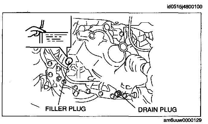 4. Remove the filler plug with gasket and add the specified amount and type of oil through the filler plug hole until the level reaches the bottom of the filler plug hole.