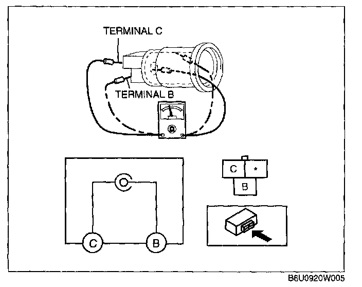 2. Inspect for continuity between the accessory socket terminals B and C using an ohmmeter as shown in the above figure.
