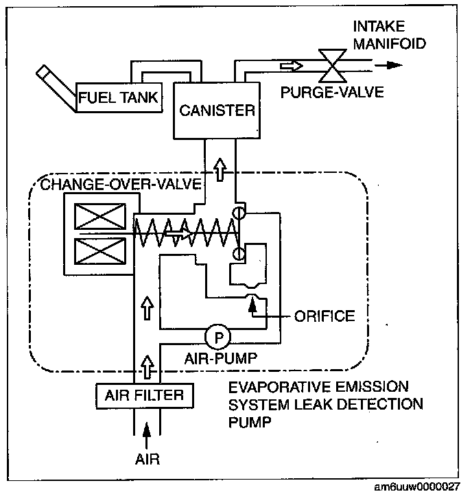 - The EVAP system test finds gas leaks in the system using the PCM to monitor changes in the air pump load current of the EVAP system leak detection pump. This test starts after sending an on-demand test signal from the M-MDS to the PCM. The PCM controls the air pump and change-over-valve operation and also stores the load current of the air pump as follows: