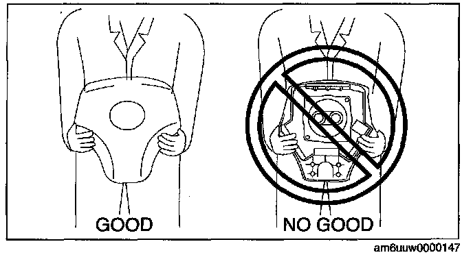 - Before removing the air bag module or disconnecting the air bag module connector, always turn the ignition switch to the LOCK position, disconnect the negative battery cable, and then wait for 1 min or more to allow the backup power supply of the SAS control module to deplete its stored power.