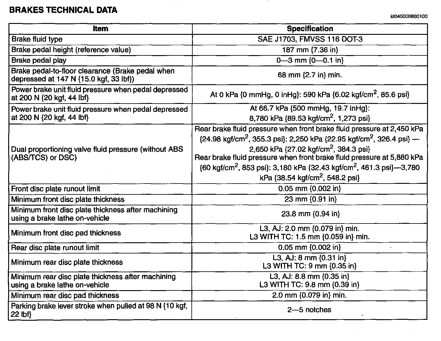Brakes Technical Data: