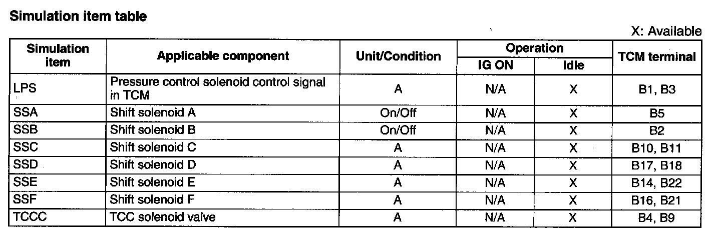 ^ If there is no operation sound from the solenoid after the simulation function inspection is performed, it is possible that there is an open or short circuit in the wiring harness, or solenoid, or sticking and operation malfunction.