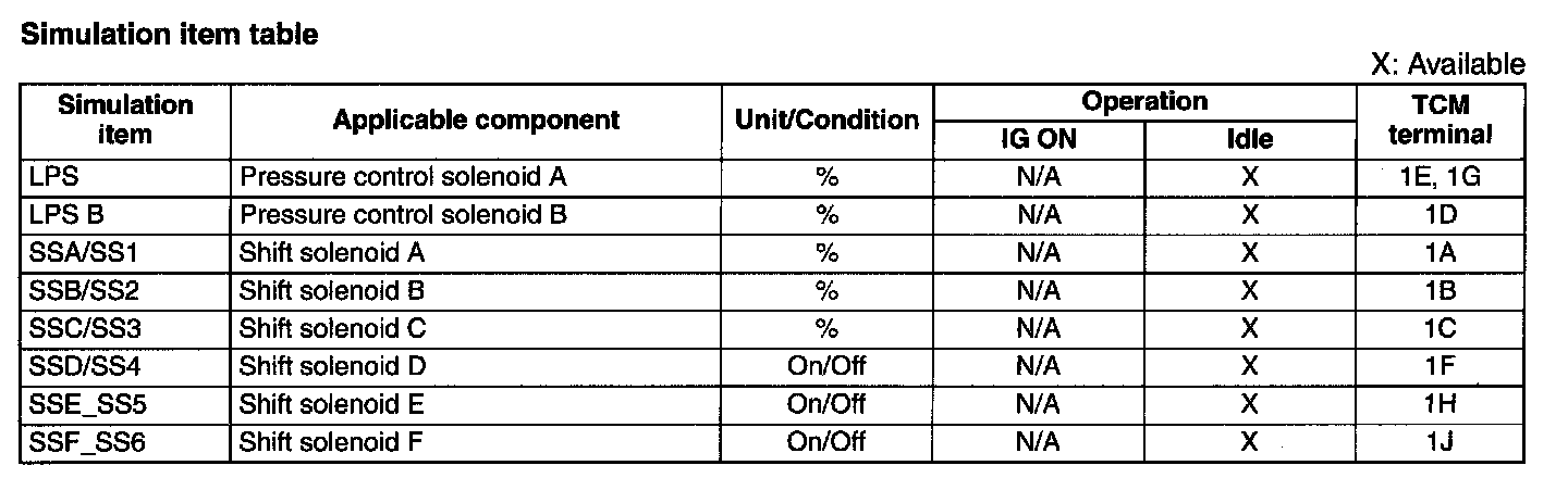 ^ If there is no operation sound from the solenoid after the simulation function inspection is performed, it is possible that there is an open or short circuit in the wiring harness, or solenoid, or sticking and operation malfunction.