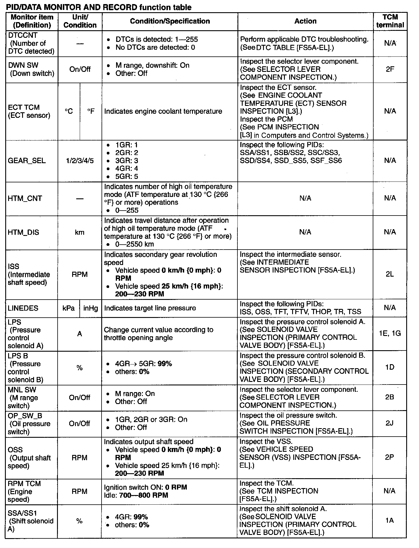 PID/Data Monitor and Record Function Table