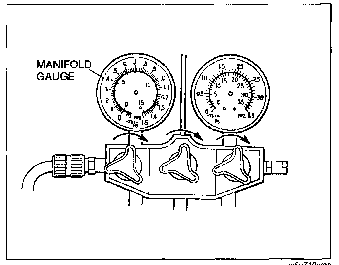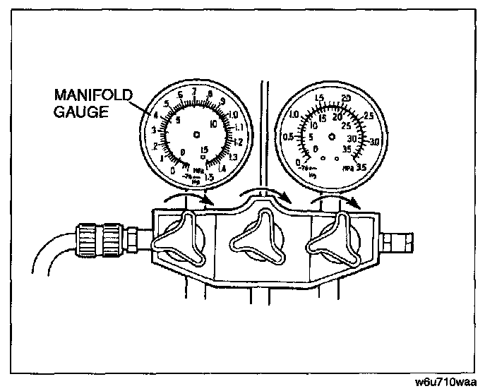 9. Verify that high and low-pressure side readings of the manifold gauge are at-101 kPa {-760 mmHg, -29.9 inHg}.Close each valve of the manifold gauge.