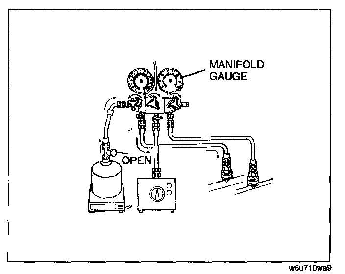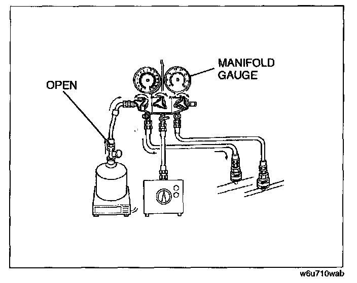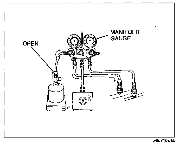 21. Open the low-pressure side valve of the manifold gauge and charge with refrigerant until the weight of the refrigerant tank has decreased 475 g {1 6.8 OZ} from the amount in Step 13.